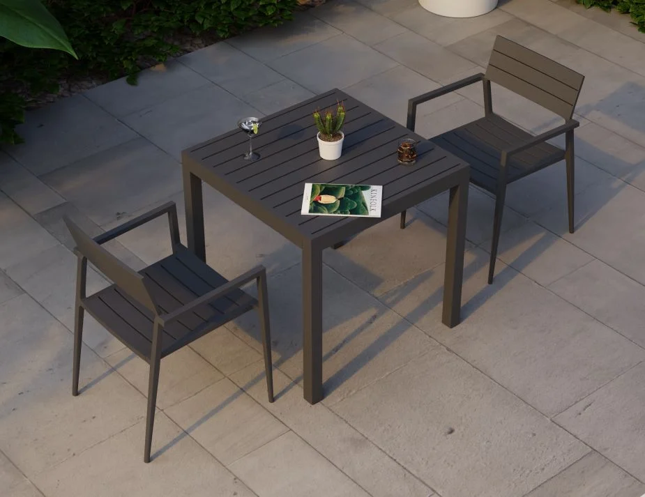 The Halki Table Matt Charcoal Aluminum is a sleek and modern outdoor table designed for commercial outfitting in hotels, restaurants, and other commercial spaces. The table’s powder-coated aluminum frame is built to withstand the wear and tear of frequent use in outdoor settings, making it a durable and long-lasting investment for any commercial furniture supplier.